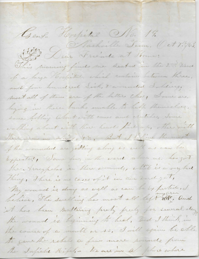 This morning finds me seated in the 2nd Ward of a large hospital which contains between three and four hundred sick & wounded soldiers; most all of them are of the latter class. Some are lying in their bunks unable to help themselves, some hobbling about with canes and crutches, some walking about with their heads tied up, others with their arms in slings, &c. But I believe the most of the wounded are getting along as well as can be expected. Some few in the ward above us has got the erysipelas in their wounds which is a very bad thing. There is no cases of it in our ward yet.