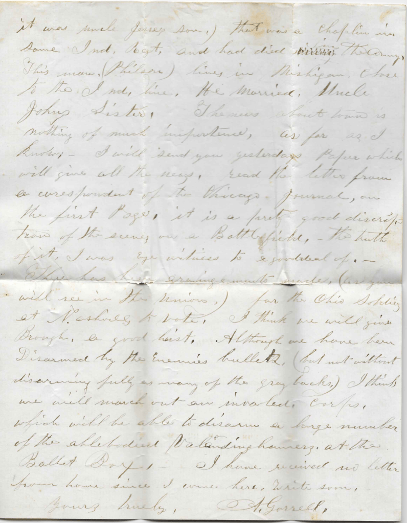The news about town is nothing of much importance as far as I know. Read the letters from a correspondent of the Chicago Journal on the first page. It is a pretty good description of the scenes on a battlefield. The truth of it, I was eye witness to a good deal of. There has been arrangements made (as you will see in the Union) for the Ohio soldiers at Nashville to vote. I think we will give Brough a good heist although we have been disarmed by the enemy’s bullets (but not without disarming fully as many of the graybacks). I think we will march out an Invalid Corps which will e able to disarm a large number of the able bodied Valandinghamers at the Ballot Box. I have received no letter from home since I came here. Write soon. yours truly, — A. Gorrell