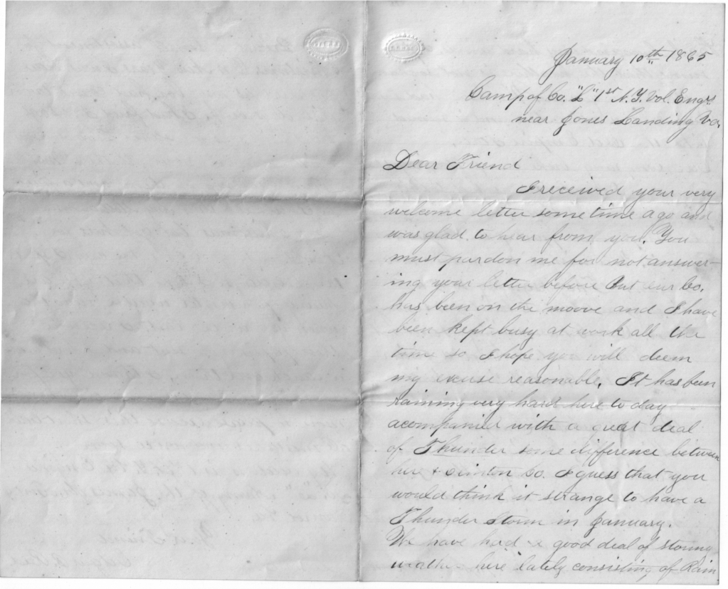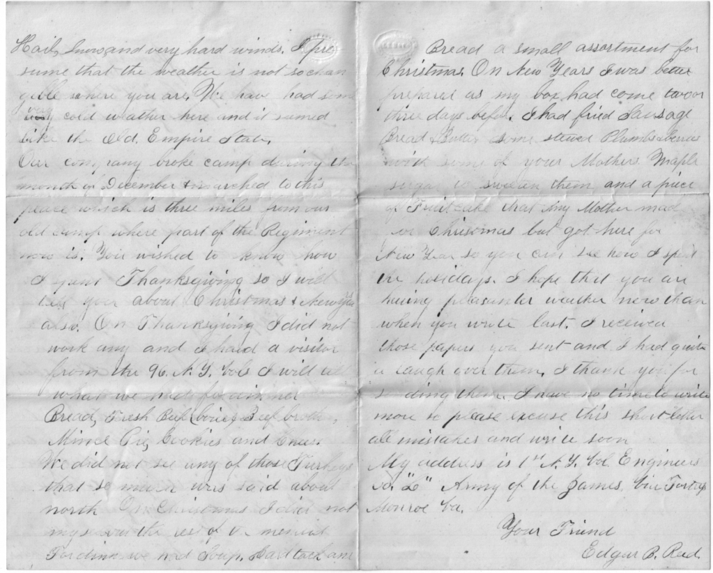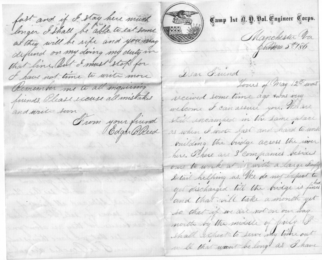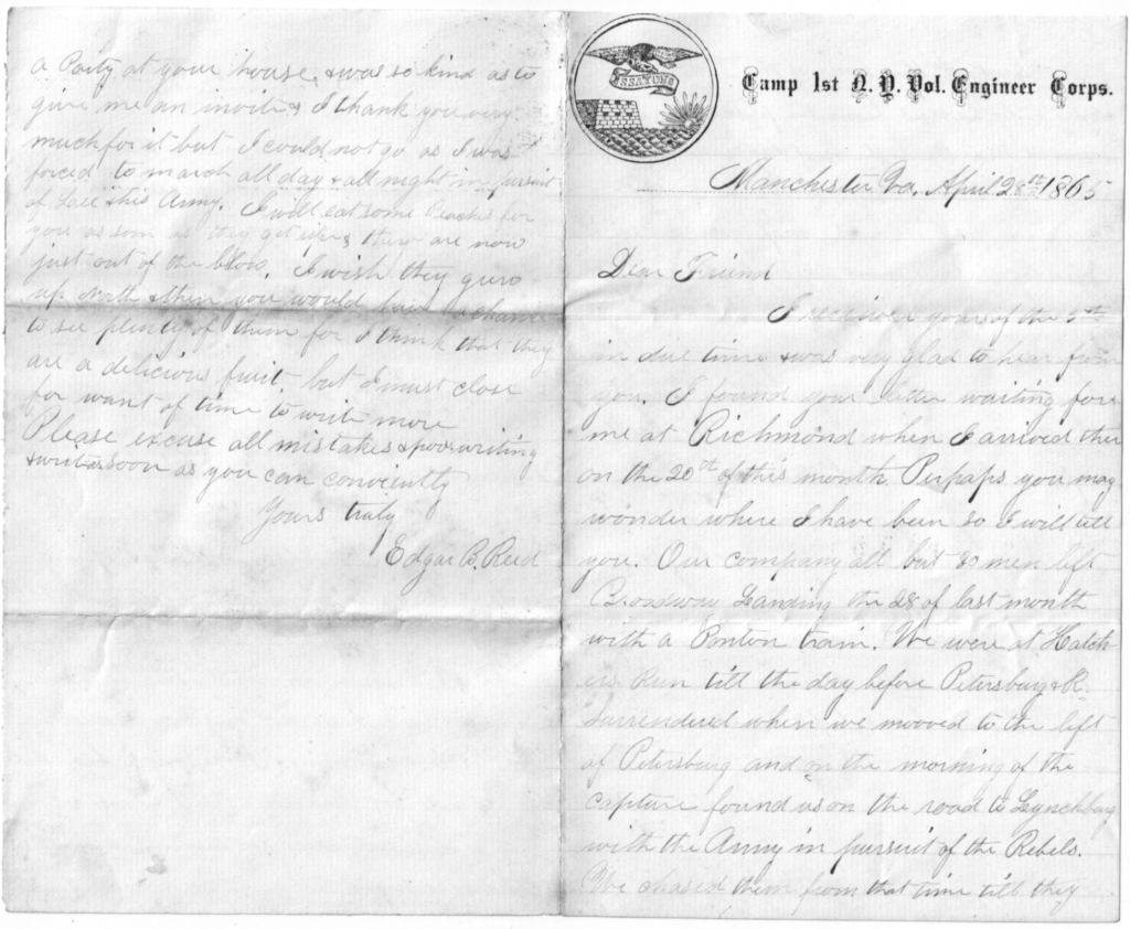 My address is 1st New York Volunteers Engineers, Co. L, Army of the James via Fort Monroe, Virginia. Your friend, — Edgar B. Reed