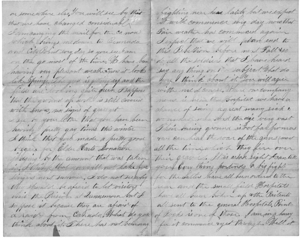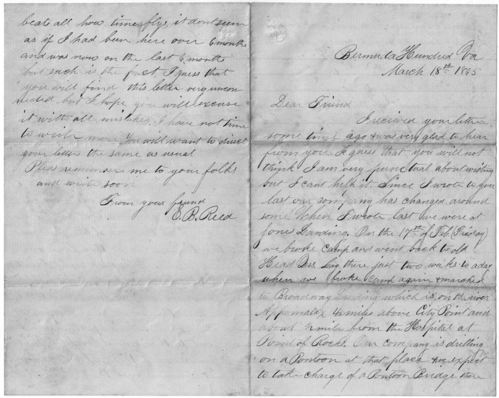 I received your letter some time ago & was very glad to hear from you. I guess that you will not think I am very punctual about writing but I can’t help it. Since I wrote to you last our company has changed around some. When I wrote last, we were at Jones’s Landing. On the 17th of February (Friday) we broke camp and went back to old headquarters. Lay there just two weeks to a day when we broke camp again & marched to Broadway Landing which is on the river Appomattox 4 miles above City Point and about ½ mile from the hospital at Point of Rocks. Our company is drilling on a pontoon at that place & we expect to take charge of a pontoon bridge there or somewhere else. You will see by this that we have changed considerably. I am carrying the mail for the company now which brings me down to Bermuda and City Point every day, so you see I am on the go most of the time.