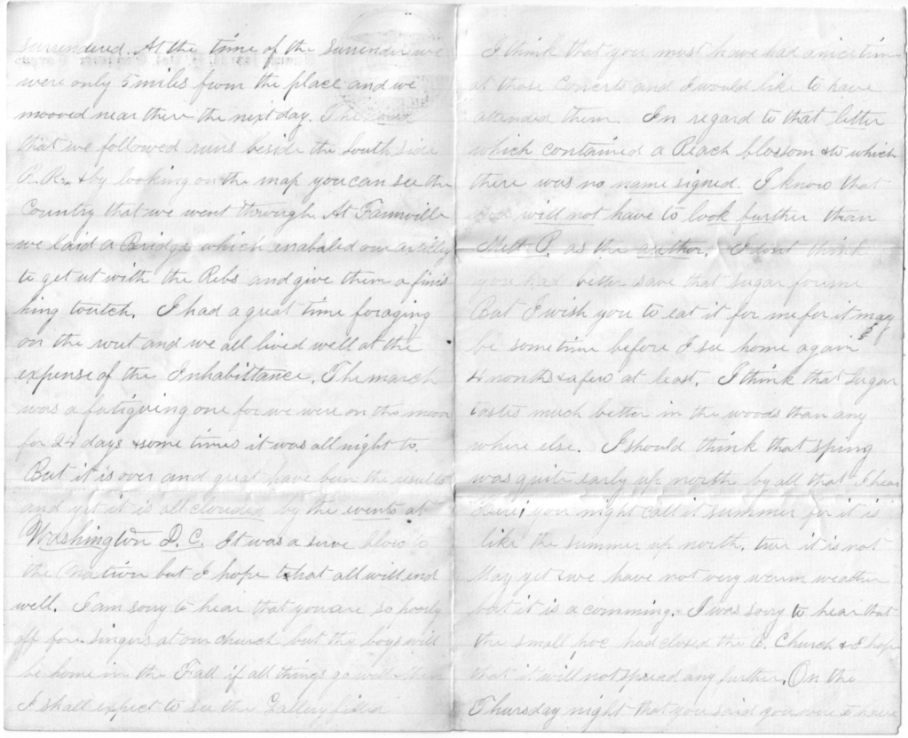 I should think that spring was quite early up north by all that I hear. Here you might call it summer though it is not May yet & we have not very warm weather, but it is a coming. I was sorry to hear that the smallpox had closed the Baptist Church & I hope that it will not spread any further. On Thursday night that you said you were to have a party at your house & was so kind as to give me an invite & I thank you very much for it, but I could not go as I was forced to march all day & all night in pursuit of Lee & his army. I will eat some peaches for you as soon as they get ripe. They are now just out of the bloom. I wish they grew up north & then you would have a chance to see plenty of them for I think that they are a delicious fruit, but I must close for want of time to write more.