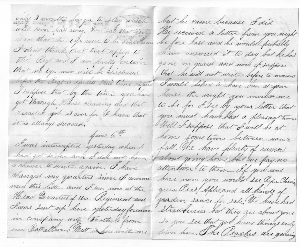 I was interrupted yesterday when I had got so far, and I did not have a chance to write again. I have changed my quarters since I commenced this letter, and I am now at the headquarters of the regiment, and I was sent up here yesterday forenoon in company with 50 others from our battalion. Merritt is here with me, but he came because I did. He received a letter from you night before last and he would probably have answered it today, but he has gone on guard and now I suppose that he will not write before tomorrow.