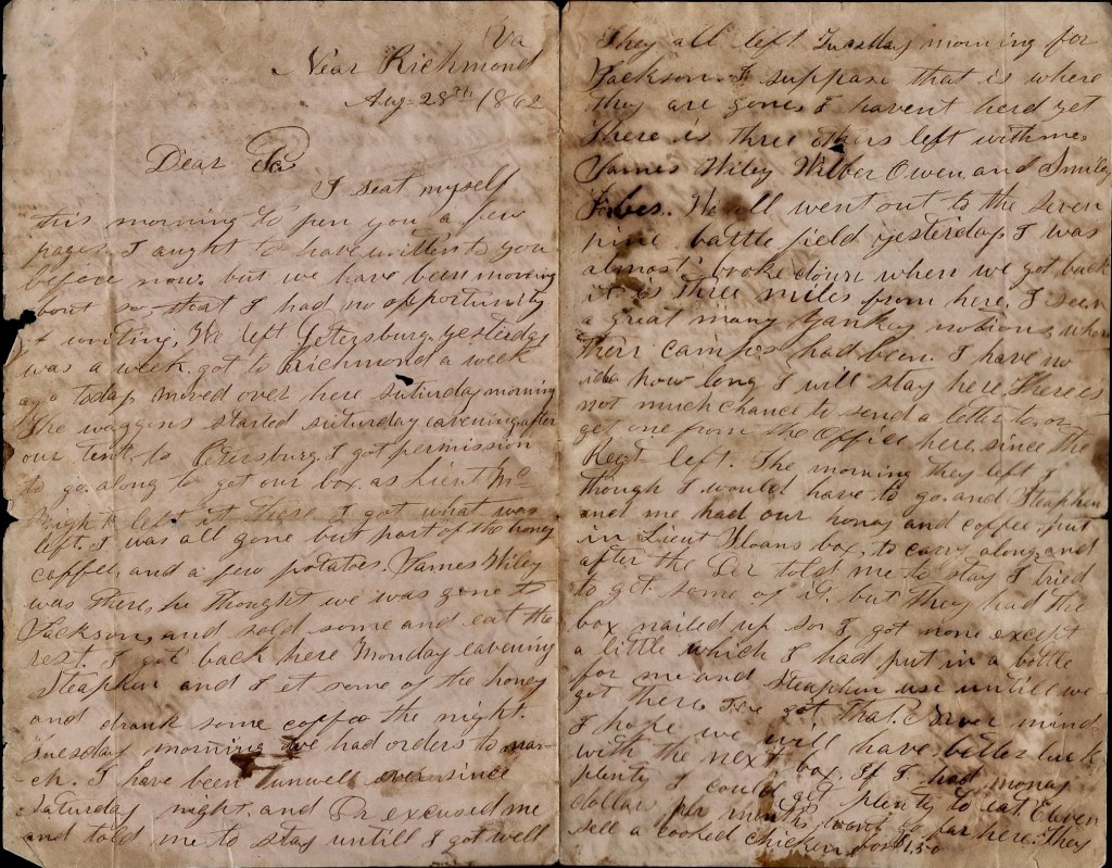 I seat myself this morning to pen you a few pages. I ought to have written to you before now but we have been moving about so that I had no opportunity of writing. We left Petersburg—yesterday was a week, got to Richmond as week ago today. Moved over here Saturday morning. The wagons started Saturday evening after our tent to Petersburg. I got permission to go along to get our box as Lieutenant [John H.] McKnight left it there. I got what was left. It was all gone but part of the honey, coffee, and a few potatoes. James Wiley was there. He thought we was gone to Jackson and sold some and eat the rest. I got back here Monday evening. Stephen and I ate some of the honey and drank some coffee that night.