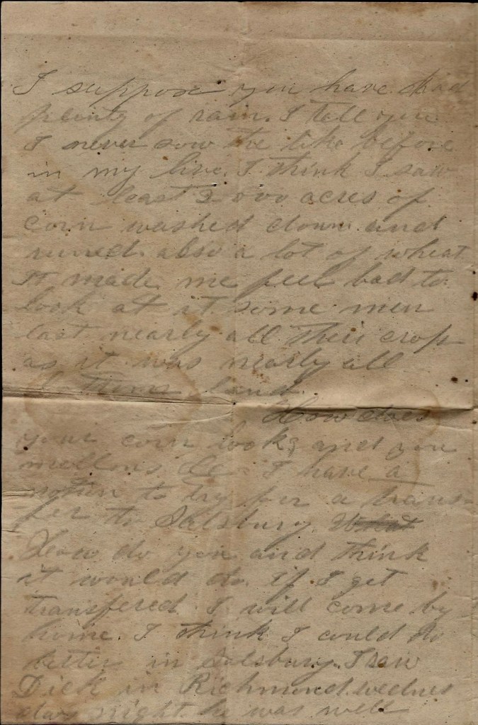 Hoes does your corn look and your melons do? I have a notion to try for a transfer to Salsbury. How do you think it would do? If I get transferred, I will come by home. I think I could do better in Salisbury. I saw Dick in Richmond Wednesday night. He was well. He told me he was going out to my regiment ext day. He said he expected he would stay with them some time. He said he saw Capt. [John] Sloan and told him he was going out today with them, They are near Richmond.