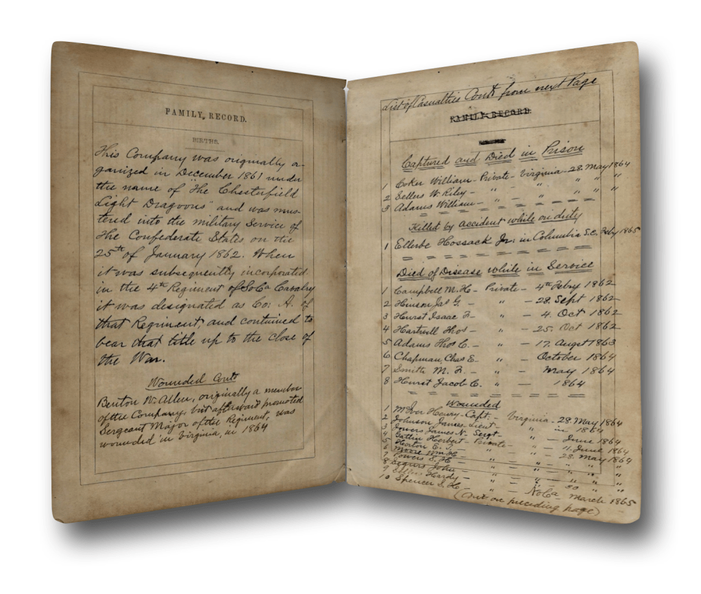 Handwritten notes pertaining to the Chesterfield Light Dragoons who were subsequently incorporated into the 4th Regiment of South Carolina Cavalry as Company A. These notes were recorded in the Holy Bible.