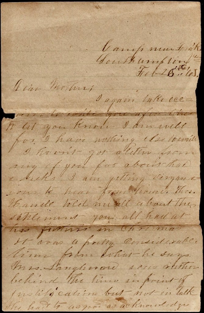 I again take occasion to write you a few lines to let you know I am well for I have nothing else to write. I haven’t got a letter from any of you for about [ ] weeks. I am getting very anxious to hear from home. Thomas Hamill told me all about the settlement you all had at his father’s I Christmas. It was a pretty considerable time from what he says. Mrs. Langhorne was rather behind the time in point of justification but not in talk. She had to as good as acknowledge her self somewhat to blame.