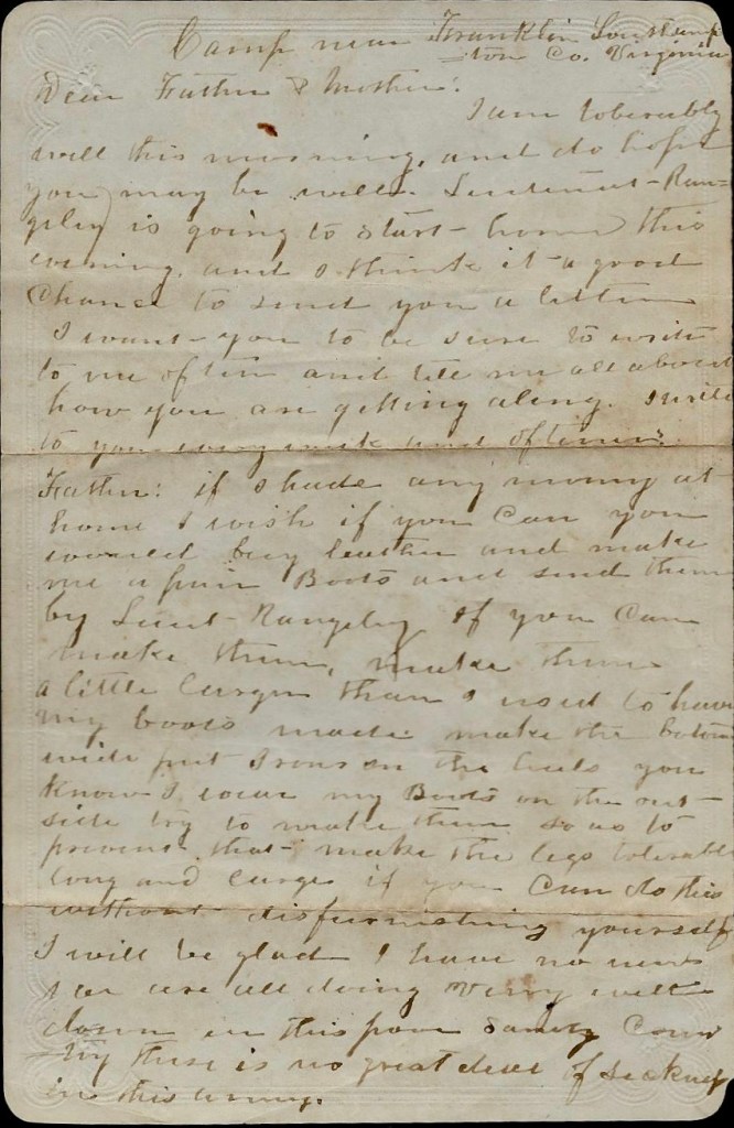 Father, if I had any money at home, I wish if you can, you would buy leather and make me a pair of boots and send them by Lt. [James Henry] Rangeley. 1 If you can make them, make them a little larger than I used to have my boots made. Make the bottom wide. Put irons on the heels. You know I wear my boots on the outside. Try to make the legs tolerable long and large. If you can do this without disfurnishing yourself, I will be glad.