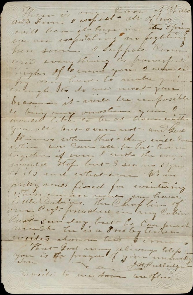 I would like to be at home with you all but I cannot. And God knows when that day will come when we can all be at home together—if ever. I wish the war would stop but I see no signs of its end whatever. We are pretty well fixed for wintering where we are now. We have little cabins. The chaplain of our regiment preached in my cabin last Sunday but he can’t preach much. He is a Presbyterian. Writes down his sermons.
