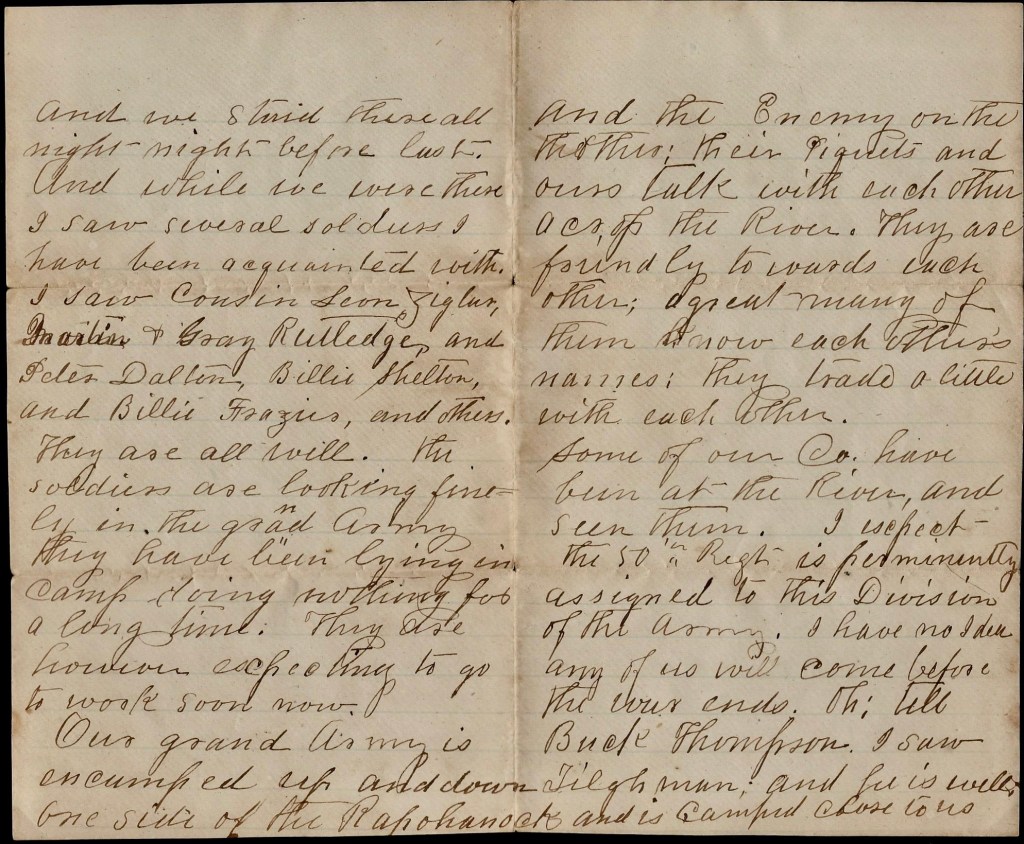 Our Grand Army is encamped up and down one side of the Rappahannock and the enemy on the other. Their pickets and ours talk with each other across the river. They are friendly towards each other. A great many of them know each other’s names. They trade a little with each other. Some of our company have been at the river and seen them. I expect the 50th regiment is permanently assigned to this Division of the Army. I have no idea any of us will come [home] before the war ends.