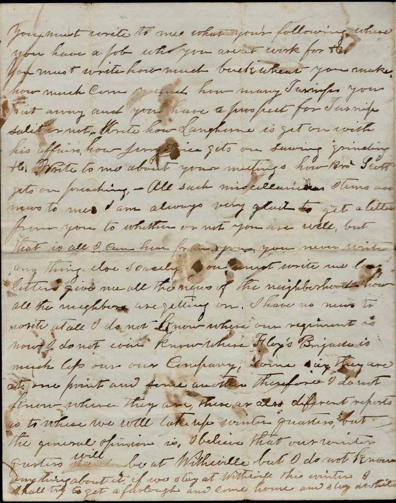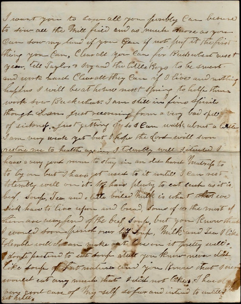 I want you to sow all you possibly can. Be sure to sow all the Mill Field and as much [ ] as you. can. Sow my land if you can. If not, put it the first thing you can. Clear all you can for buckwheat next year. Tell Taylor & Ivy and the little boys to be smart and work hard. Clear all they can. If I live and nothing happens, I will be at home next spring to help them sow buckwheat.