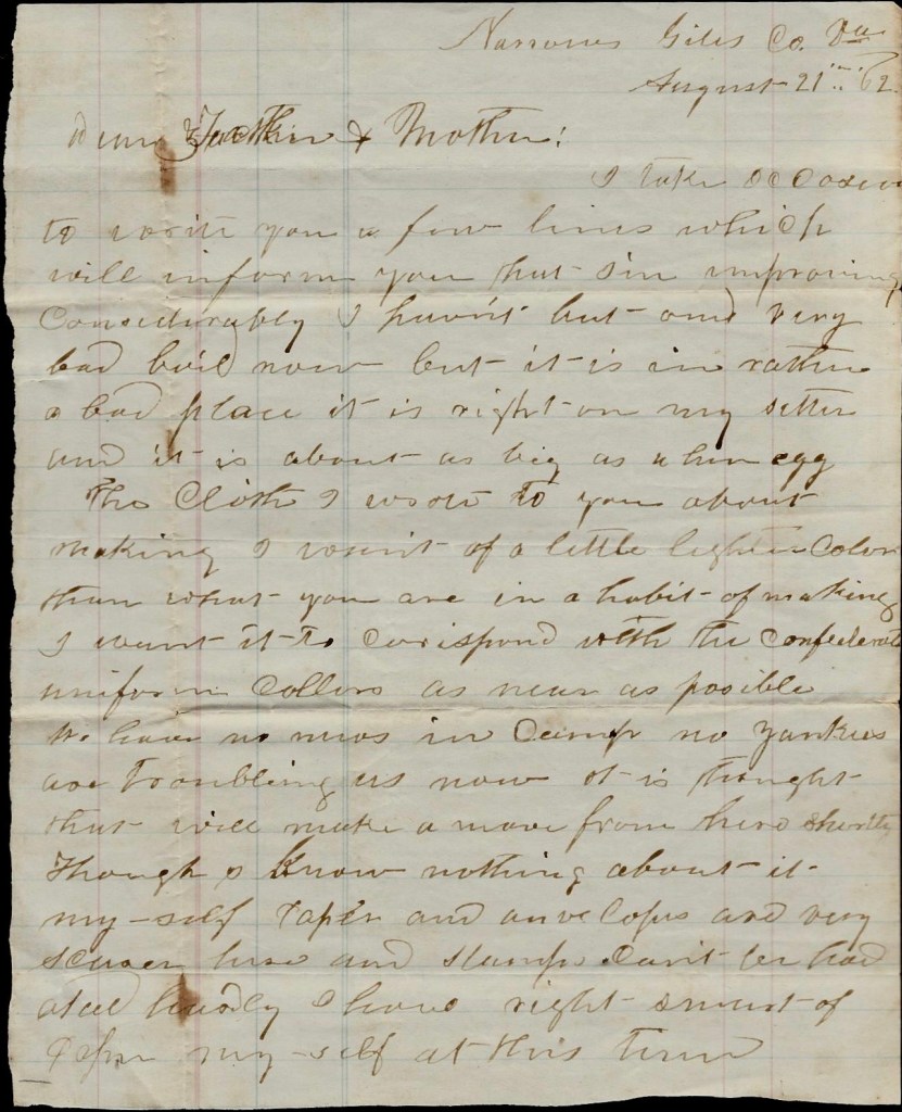 Oh! Mother, I want you to make me cloth enough as we spoke about to make a coat, 2 pair pants, and prepare me a lot of socks by fall. I want you to do this if I can get wool at any price without disfurnishing yourself. I don’t want you to disfurnish yourself. I had rather pay any price almost for wool and have you to make my clothing than to draw them because Confederate clothing is no con____ and the ugliest stuff you ever saw. I want mine nicely mixed black and white.