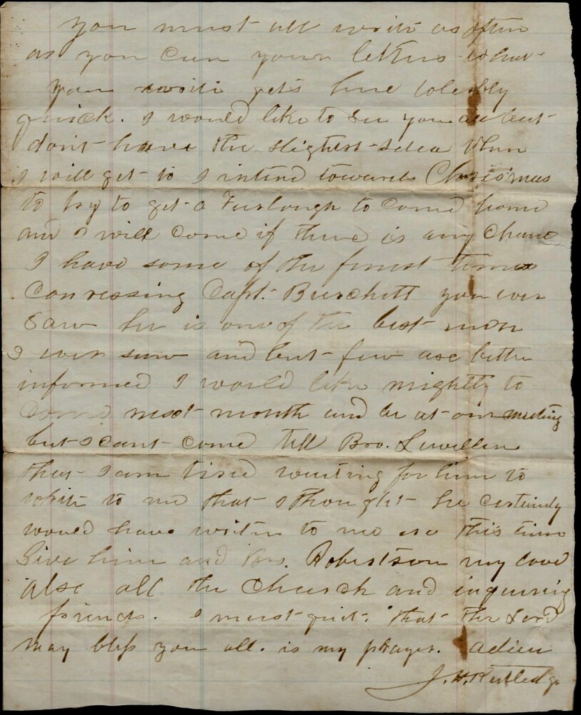 Oh! I will complain at Bro. Lewellen some for not writing to me. I wrote to him a long time ago and he got my letter and has not answered it yet. I hope you [have] the enjoyment of all the immunities of Providence. Your most affectionate son, — J. H. Rutledge