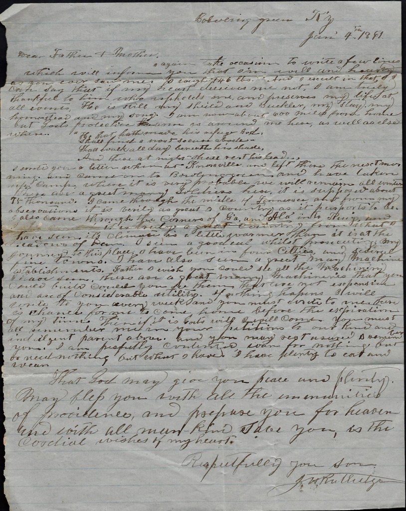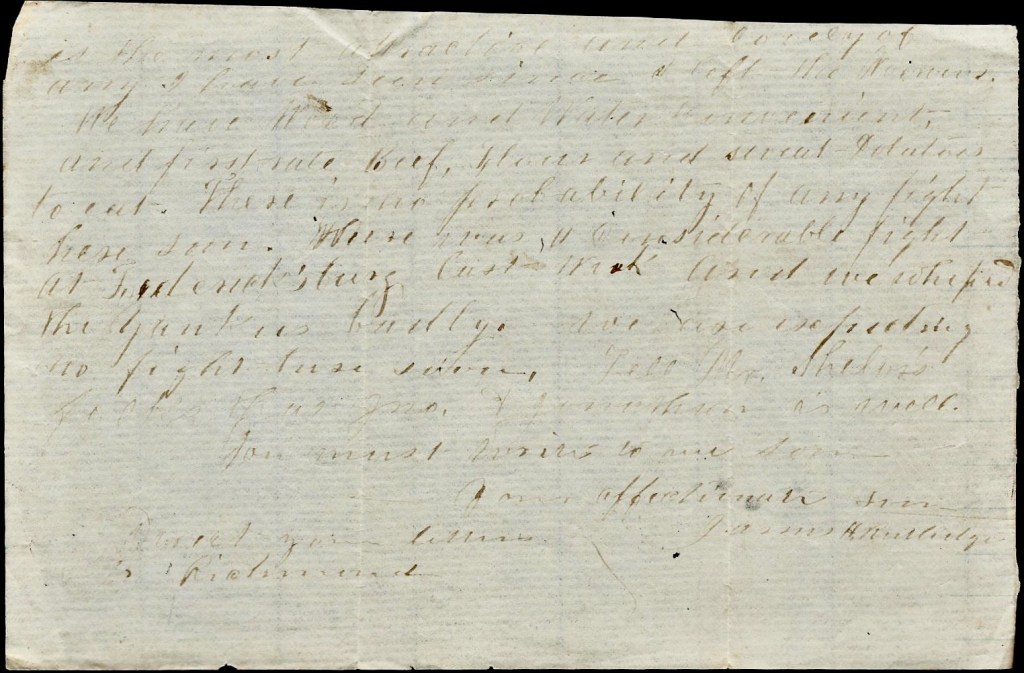 I started from the Narrows, harassed considerably with tooth and jaw ache or rather neuralgia, and I broke down the first day, but after that, I commenced improving and have arrived here (five miles southeast of Richmond) in fine health and spirits, and did enjoy my trip very well. I have seen the magnificent City of Richmond and the elegant Lynchburg and various places of minor importance, but the site on which we are encamped is the most attractive and lovely of any I have seen since I left the Narrows. We have wood and water convenient and first rate beef, flour, and sweet potatoes to eat. There is no probability of any fight here soon. There was a considerable fight at Fredericksburg last week and we whipped the Yankees badly. We are expecting no fight here soon. Tell Mr. Shelor’s folks that Jno. and Jonathan is well. 1 You must write to me. Your affectionate son, — James H. Rutledge.