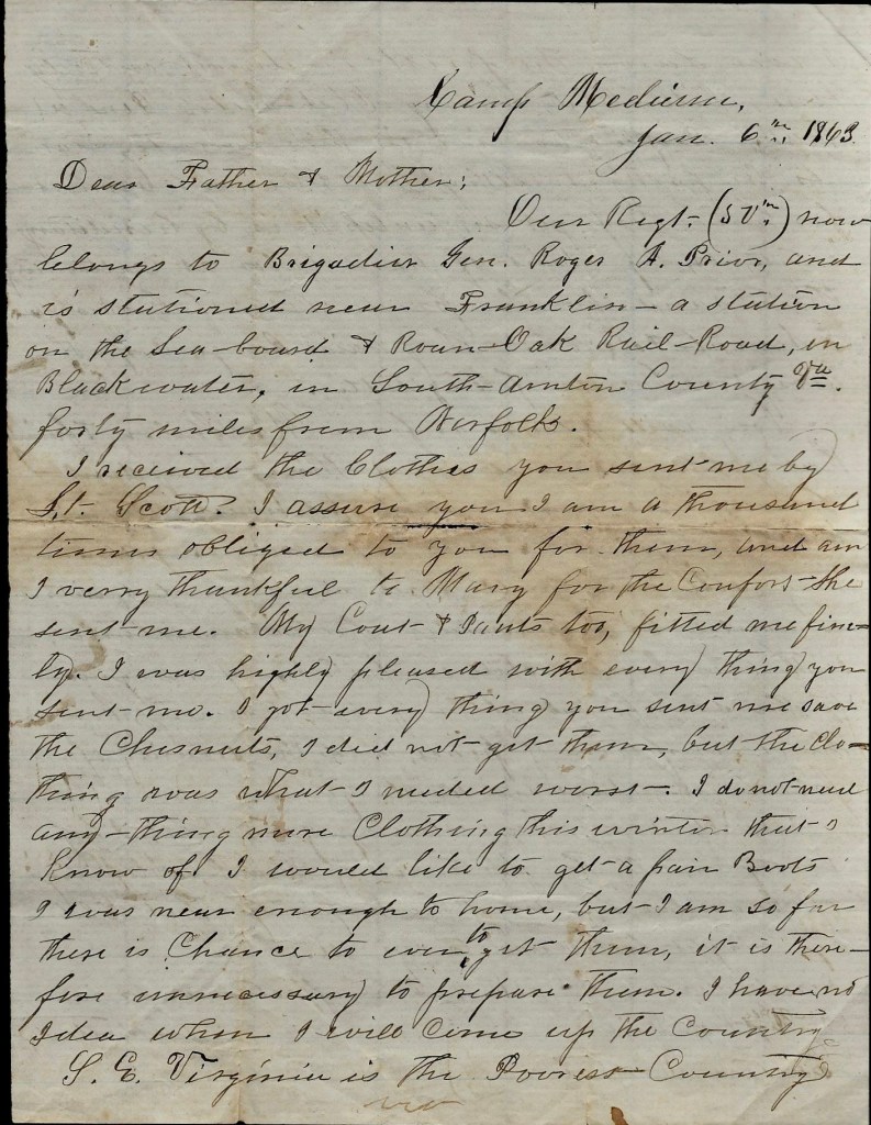 I received the clothes you sent me by Lt. [Asa B.] Scott. 1 I assure you, I am a thousand times obliged to you for them, and am very thankful to Mary for the comfort she sent me. My coat and pants too, fitted me finely. I was highly pleased with everything you sent me. I got everything you sent me save the chestnuts. I did not get them but the clothing was what I needed worst. I do not need anything more clothing this winter that I know of. I would like to get a pair of boots. I was near enough to home, but I am so far there is chance ever to get them. It is therefore unnecessary to prepare them. I have no idea when I will come up the country.