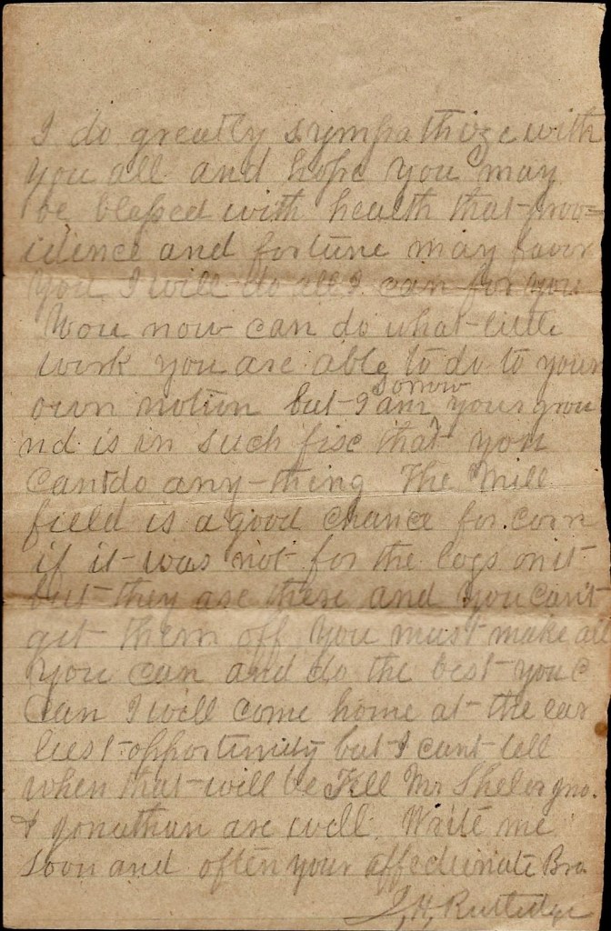 You must make all you can and do the best you can, I will come home at the earliest opportunity but I can’t tell when that will be. Tell Mr. Shelor Jno. and Jonathan are well. Write me soon and often. Your affectionate brother, — J. H. Rutledge