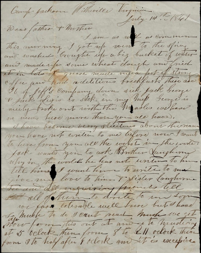 I am as well as common this morning. I got up, went to the spring and washed, brought up a big basket of water and made up some wheat dough and fried it in lots of grease. Made me a pot of strong coffee and had a delicious breakfast. There are 30 of Jeff’s Company down sick. [Andrew] Jack George & [Andrew] Jack Lewis is sick in my mess. George is nicely broke out with the measles.