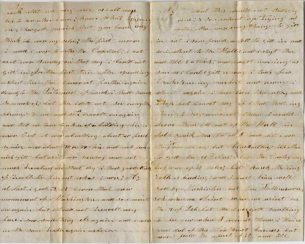 The first move I made I was towards the Capitol, but as it was Sunday on that day, I could not get in for the first time. After spending a short time there, I moved further again down to the Potomac of works I had heard so much of, but here I did not see anything strange to me and so we traveled on again until we came to a kind of a building. It was a building about 20 feet square and about 70 or 80 high and not finished yet. But as it was Sunday and not much traveling on that day, I had a good deal of trouble to find out what it was. At last I got it. It was that new monument of Washington and so I went on again. But I had not traveled very far [when] I saw something else again and I was in the same trouble again as before. But this would not satisfy me so I went up trying whether there was any change to get in, but I soon found a toll to get in and so I went to the Hall and I stopped there until 8 o’clock, and next morning as soon as I could get away, I took a few crackers in my pocket and away I went again. I have been there all day and a half but I must say if I had anything to say amongst them, I would drove them all out of the Hall in double quick time for all I heard. Well, I wrote that it were nothing but blackguarding in order to get the 16 dollars and the country may take care of itself.