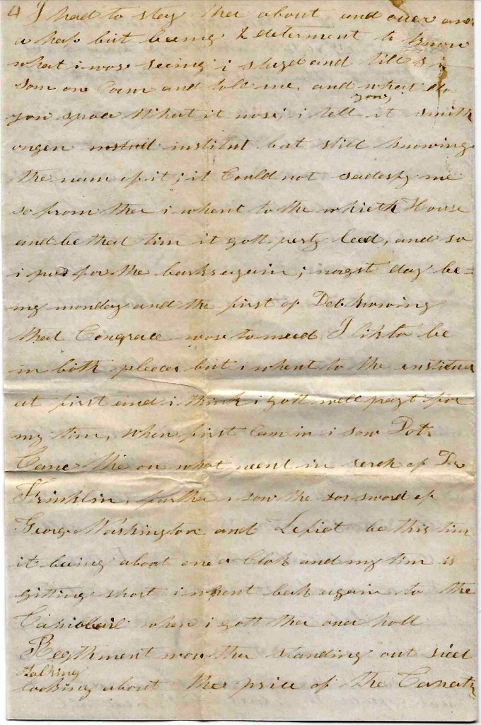 When first I came in, I saw Dr. [Elisha Kent] Kane, the one who went in search of [polar explorer] Dr. [John] Franklin. Further I saw the sword of George Washington and Lafayette. By this time, it being about one o’clock and my time is getting short, I went back again to the Capitol. When I got there their regiment was there standing outside talking about the price of the [ ].