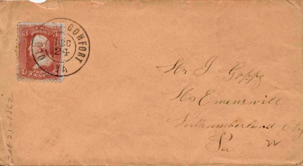 I can’t be certain of the addressee though I’m confident it was mailed to McEwensville, Northumberland county, Pennsylvania.