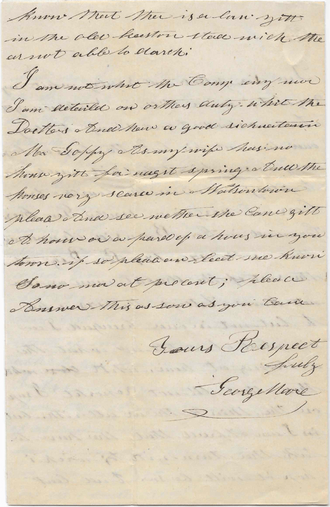 I am not with the company anymore. I am detailed on other duty with the doctors and have a good situation. Mr. Goppy, as my wife has no house yet for next spring, and the houses very scarce in Watsontown, please see whether she can get a house or a part of a house in your town. If so, please let me know. So no more at present, please answer this as soon as you can.