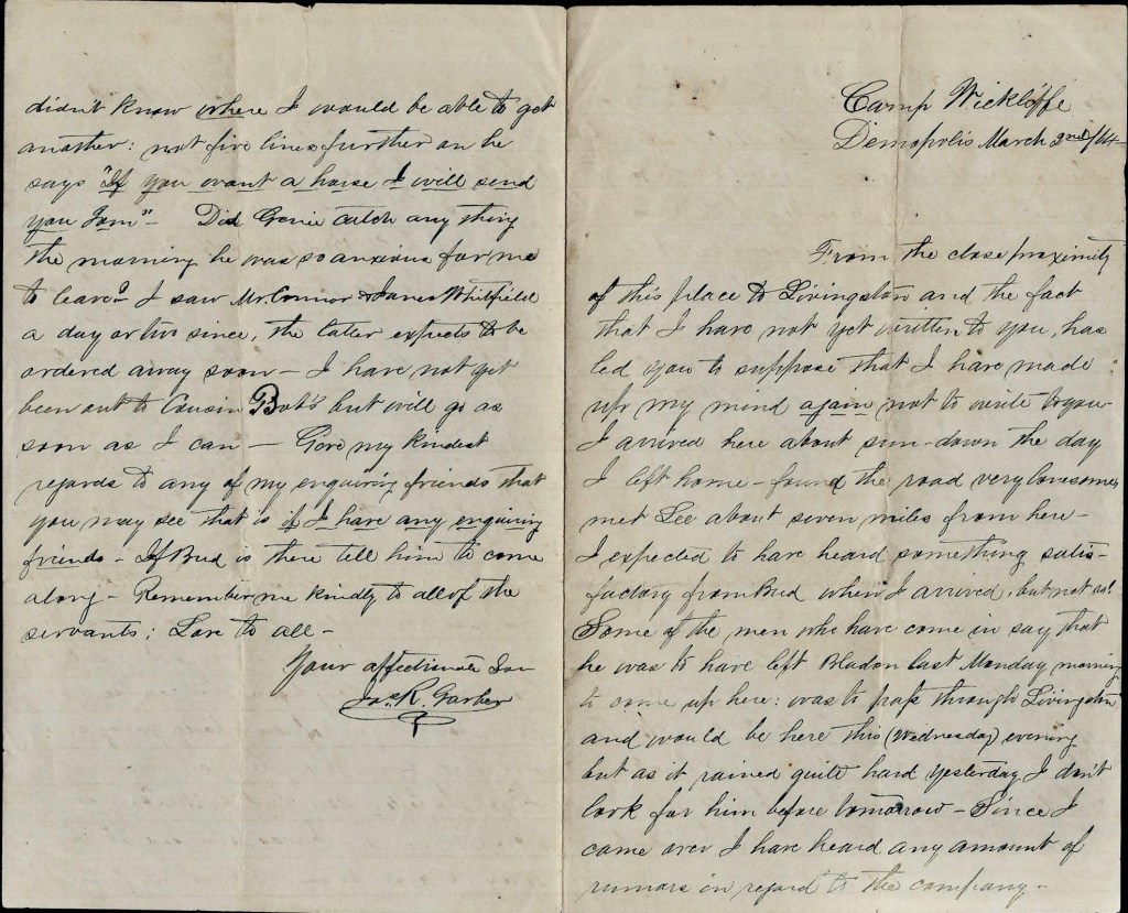 Since I came over, I have heard any amount of rumors in regard to the company. Some say that an order has been issued from Richmond dismounting the whole regiment: that the Conscript Office are trying and are going to conscript all the members of the conscript age and to send all over seventeen and under eighteen into camps of instruction. Others say that Col. [Nathaniel] Wickliffe is not pleased with our election returns, that we shall reorganize, and some say that Bud told them that he was going to have another election. There are some in the other squad who are now sorry that they formed the junction with us and would get out if they could, and if Bud goes to reorganizing, they may take that as an opportunity & leave us.
