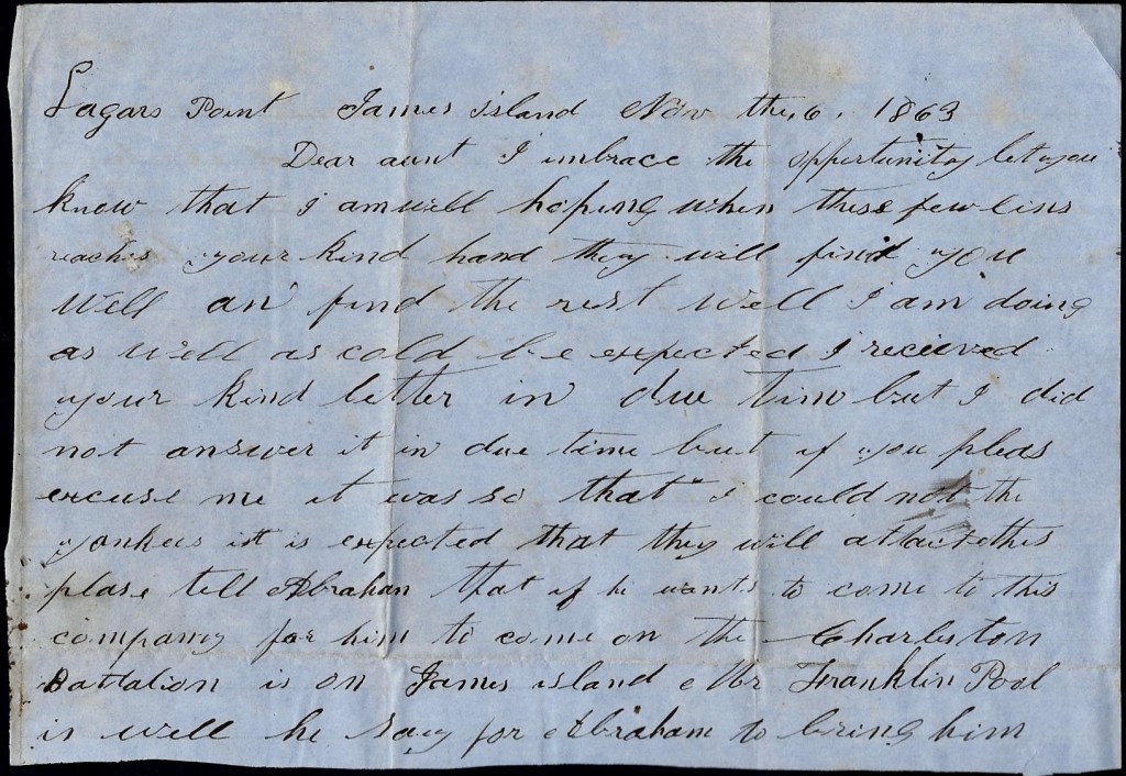 Tell Abraham that if he wants to come to this company for him to come on. The Charleston Battalion is on James Island. Mr. Franklin Pool is well. He says for Abraham to bring him something to eat if he comes down. We are all doing fine. You must excuse bad writing and spelling. I must come to a close so i remain your loving nephew until death.