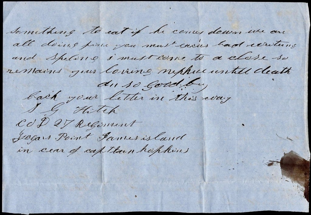 The following letter was written by Pvt. Silas “Green” Hitch (1847-1871) who served in Co. D (Sumter Guards), 27th South Carolina Infantry (formed in 1863 by merging the Charleston Battalion Infantry and 1st S. C. Sharpshooter Battalion). Green survived the war, despite suffering from chronic diarrhea for much of his service, married Elizabeth Pinson in 1866, and died five years later at the age of 24. He was the son of Joseph Allen Hitch (1822-1896) and Elizabeth Caroline Motes (1821-1900) of Laurens, Laurens county, South Carolina.