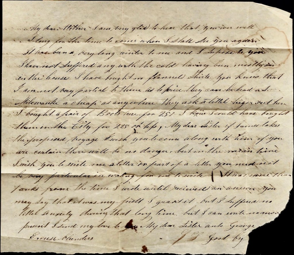 My dear Mother, I am very glad to hear that you were well. I long for the time to come when I shall see you again. It has been a very long winter to me and I suppose to you. I have not suffered any with the cold having been mostly in the house. I have bought no flannel shirts. You know that I am not very partial to them. As to price, they can be had at Milwaukee as cheap as anywhere. They ask a little bigger here. I bought a pair of boots here for $2.50. I know I could have bought them in the city for $2.25 or less.
