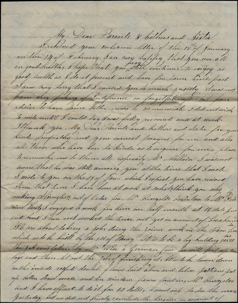 I thank you, my dear parents and brother and sister, for your kind sympathy and your earnest prayers for me and also all those who have been so kind as to enquire for me. Please to remember me to them all—especially Mr. Millain. I was not aware that he was still among you at the time that I wrote. I wrote to you on the 19th of January which I expect you will ave received since that time. I have been at work at what think you? Why making shingles!! out of cedar for Mr. Reynolds, son-in-law to Mr. Frisby, mine host. I engaged to work for him one half month at 16 dollars, food and board. I have not worked the time out yet on account of his absence.