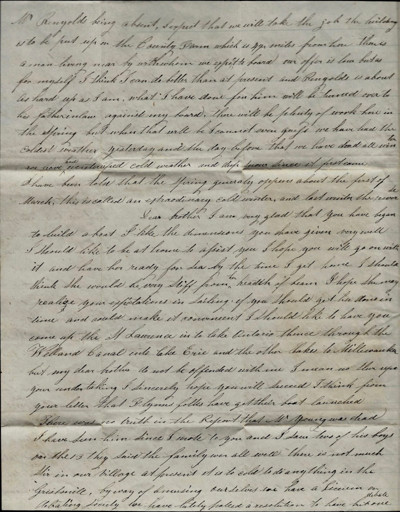 Dear brother, I am very glad that you have begun to build a boat. I like the dimensions you have given very well. I should like to be at home to assist you. I hope you will go on with it and have her ready for sea by the time I get home. I should think she would be very stiff from her breadth of beam. I hope she may realize your expectations in sailing. If you should get her done in time and could make it convenient, I should like to have you come up the St. Lawrence into Lake Ontario, thence through the Welland Canal and Lake Erie and the other Lakes to Millewaukee [Milwaukee]. But my dear brother, do not be offended with me. I mean no slur upon your undertaking. I sincerely hope you will succeed. I think from your letter that Flynn’s folks have got their boat launched.