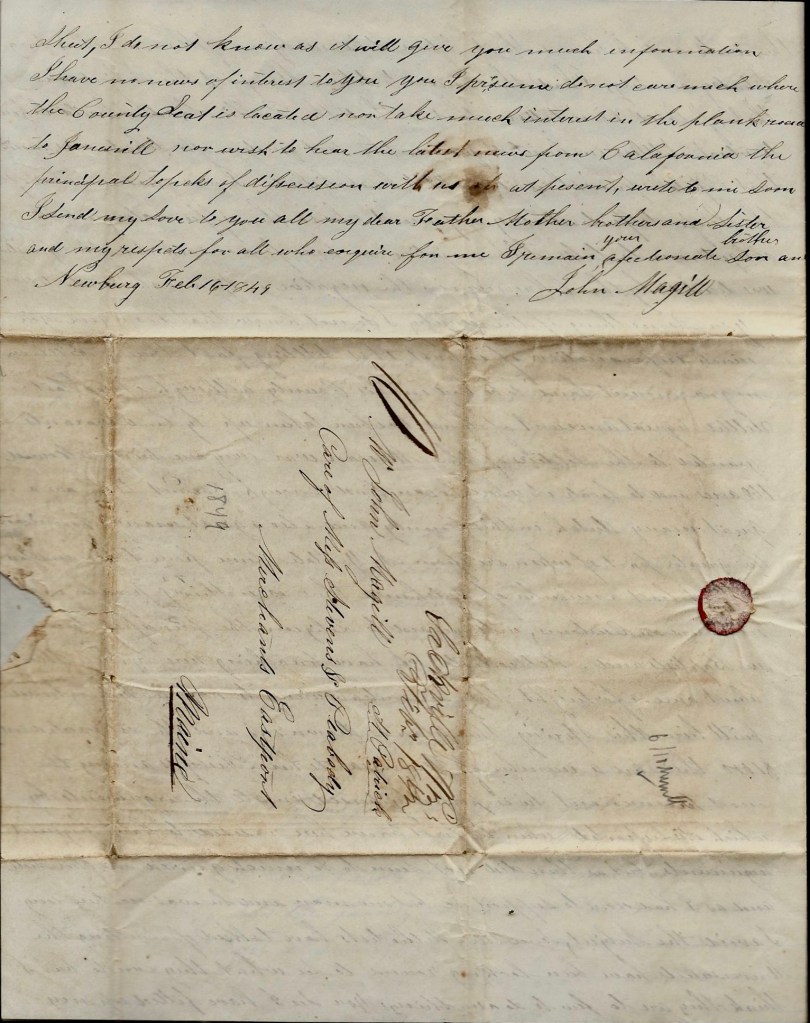 Even with the address on the stampless cover of this letter, I was unable to confirm the identity of this letter which was signed John Magill and addressed to “Mr. John Magill at Patrick, Care of Messrs. Stevens & Peabody, Merchants, Eastport, Maine.”
