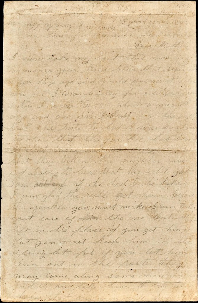 I was sorry to hear that the Yankees has been so close there and was sorry also that they taken the neighbor’s mule, and sorry to hear that the rebels got Sam. If he had to be taken, I am glad the rebels got him before the Yankees. You must make Green take good care of the one that they left in his place. If you get him fat, you must keep him in the Spring lot, for if you let him run out in the pasture, there may come along some more Yankees and take him. I am in hopes that our men will keep them back from that part of the country, for they will destroy things as they go. I hope that Gen. Hood will whip them clear out from Georgia.