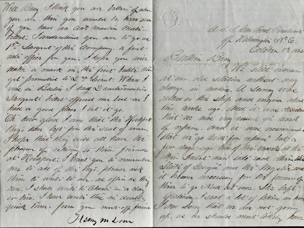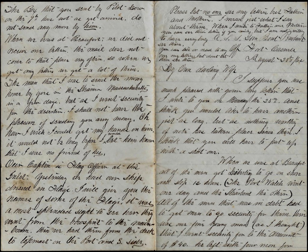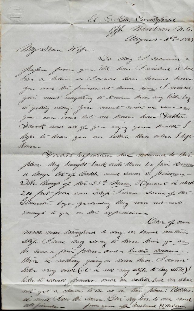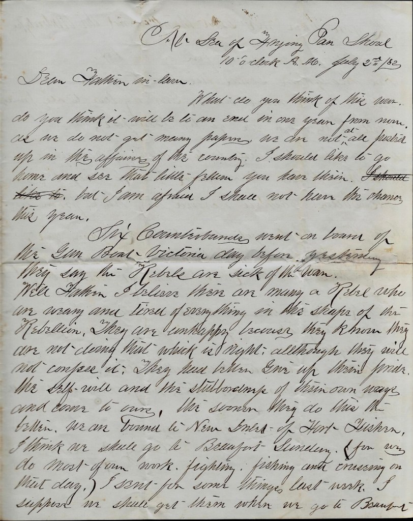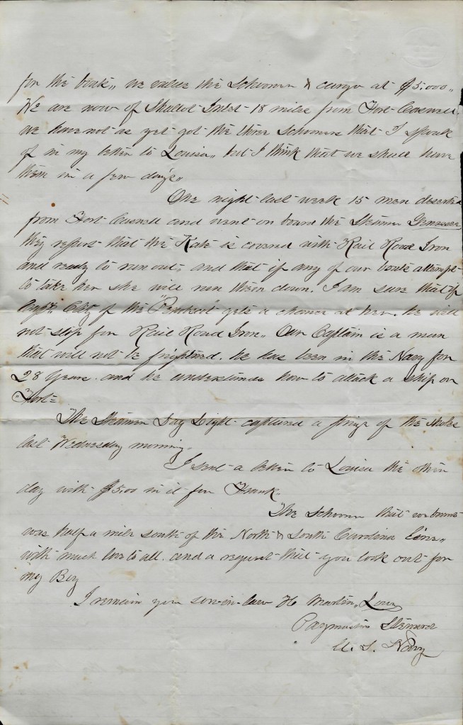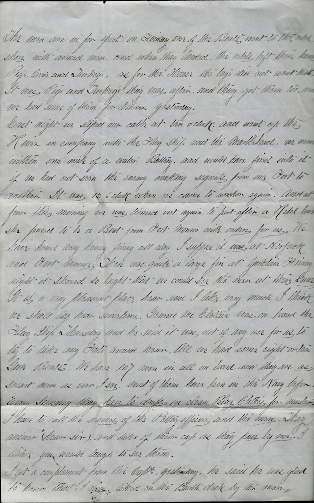 There is no news here now among the vessels; we see two Rebel steamers twice a day which come down, look at us, turn round and goes home to report what we are doing. Last week one of our gunboats exchanged a few shots with them but neither hot. He has but a little more careful sense since but never mind, we will have him soon. We are anxiously awaiting the arrival of some transport wit troops so to put in the Forts (for there is three of them) when we taken them. There is five gunboats at this place. The brst looking one is the Penobscot and she has the men and guns that will do the work—at least we have always come out best.