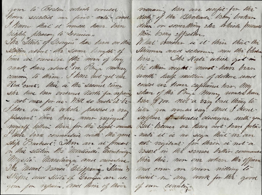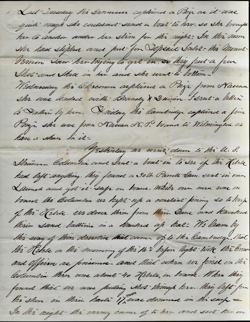 Last Tuesday the Genessee captured a prize. As it was quite rough, she couldn’t send a boat to her so she brought her to anchor under her stern for the night. In the morn she had slipped and put for Topsail Inlet. The Mount Vernon saw her trying to get in so they put a few shot and shell in her and she went to bottom. Wednesday the Checorora captured a prize from Nassau. She was loaded with brandy & quinine. I sent a letter to Father by her. Friday the Cambridge captured a fine prize. She was from Nassau N. P. bound to Wilmington. We have a share in it.