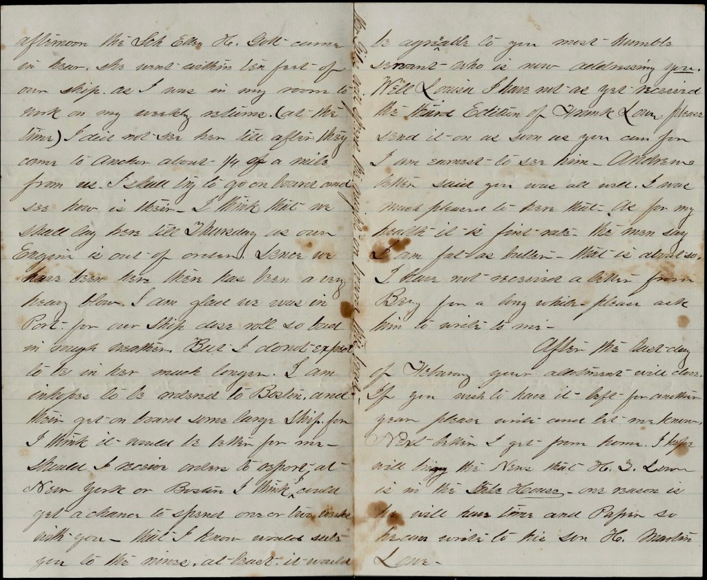 We have Rebel papers on board as late as the 9th. Write soon and give my best respects to all friends. Send a few stamps. From your most affectionate husband, — Henry M. Lowe, Paymaster Clerk, U. S. N.