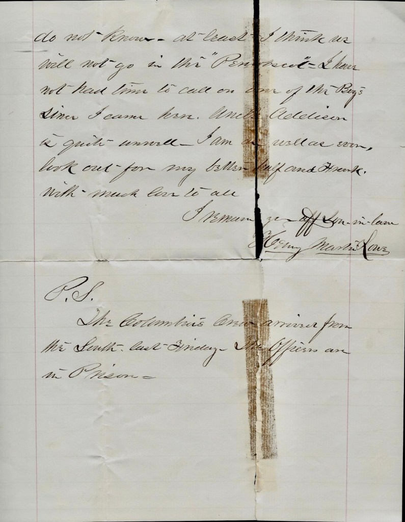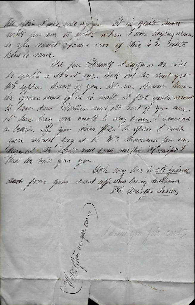 The Paymaster is well. I am in good health. Give my love to all friends and kiss my little Frank. From your affectionate husband, — Henry Martin Lowe