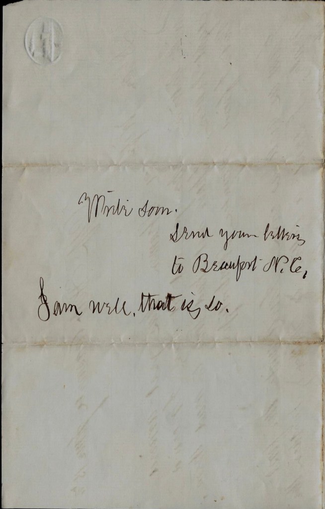 We are bound to New Inlet of Fort Fisher. I think we shall go to Beaufort Sunday (for we do most of our work, fighting, fishing, and cruising on that day). I sent for some things last week. I suppose we shall get them when we go to Beaufort. If you have not sent them, send the Ambrotypes the paymaster sent for in the box. Mr. Hodgkins sends his love to you. Tell Benny [Benjamin F. Blatchford] he must write. Give my love to all friends. I will write when we go to Beaufort. My next letter will be to Susan and Edward. Let me know how much Frank’s weight is. Has Doctor Haskell received any letter from me? Has Mom Pool got down to Dock Square yet? Let me know at what place the Rockport Company are. I have wrote to Robert but have not received any answer.