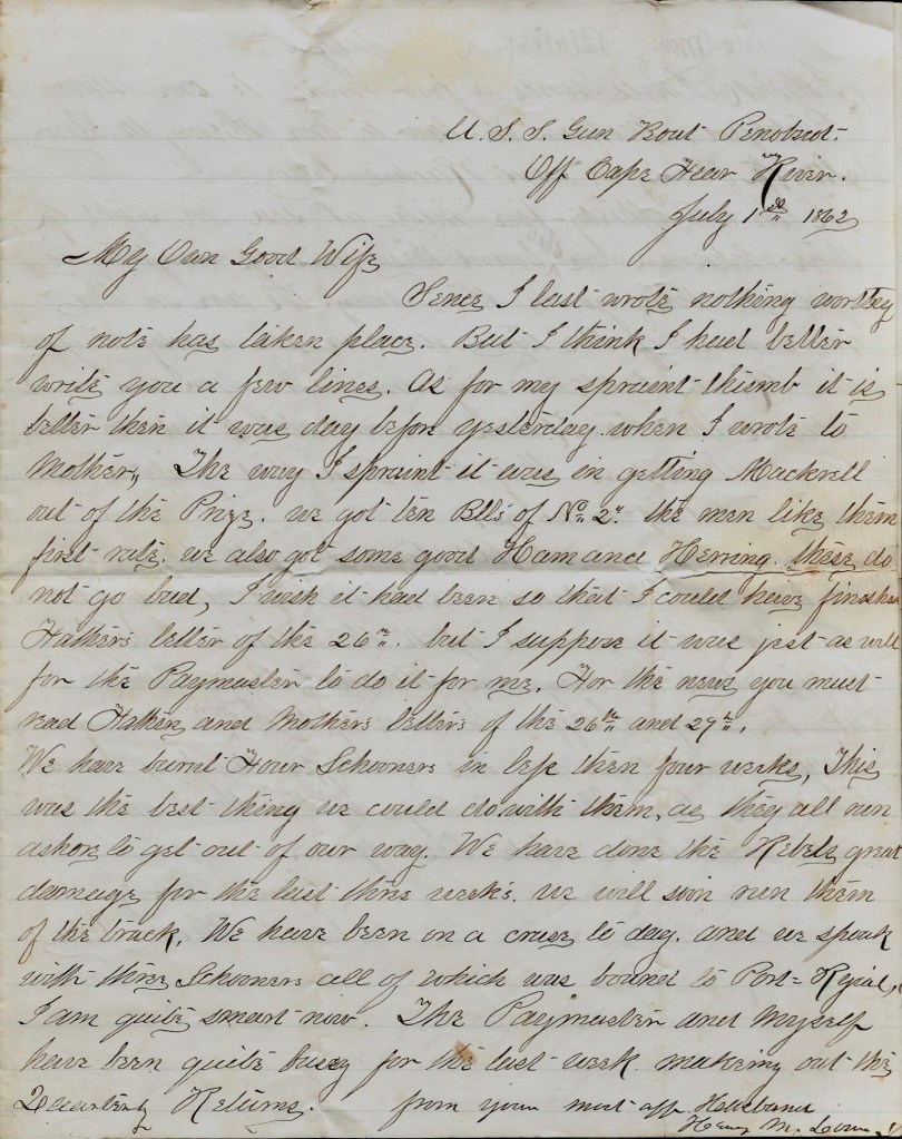 Since I last write, nothing worthy of note has taken place but I think I had better write you a few lines. As for my sprained thumb, it is better than it was day before yesterday when I wrote to Mother. The way I sprained it was in getting mackerel out of the prize. We got ten barrels of No. 2. The men like them first rate. We also got some good ham and herring. These do not go bad. I wish it had been so that I could have finished Father’s letter of the 26th but I suppose it was just as well for the Paymaster to do it for me. For the news, you must read Father’s and Mother’s letters of the 26th and 29th.