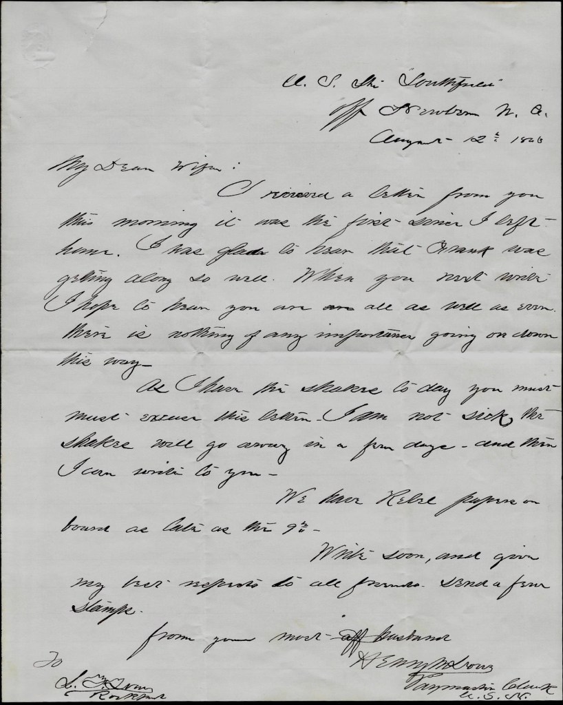 You will please send me two undershirts in the box with the boots. Give my love to all friends from your most affectionate husband, — Henry M. Lowe, U. S. N.