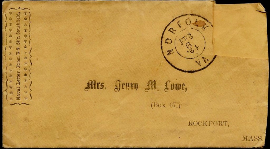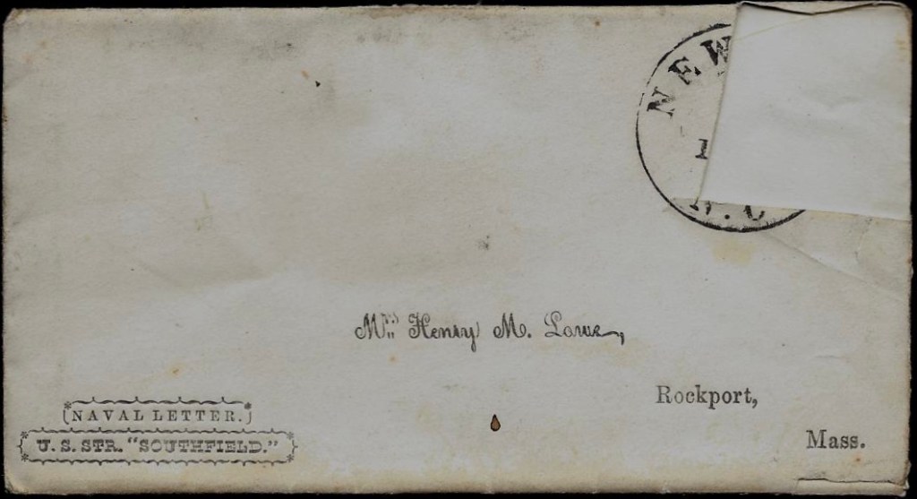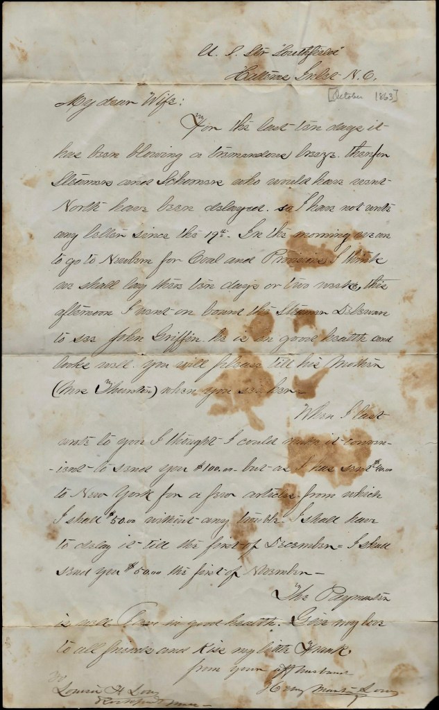 During his time in the service, Lowe wrote numerous letters home to his wife and parents. The Penobscot was built by C. P. Carter of Belfast, Maine, launched on November of 1861, and delivered to the Navy in Boston in January of 1862. Initially assigned to the North Atlantic Blockading Squadron, she was later shifted to the Gulf of Mexico, joining the blockade ships cruising off the Texas coast. Lowe served on the Penobscot through almost all of 1862 and early into 1863. After spending two or three month ashore in the winter of 1863-64, he was reassigned to the U. S. Steamer Southfield, a pre-war ferry boat that was converted into a sidewheel steam gunboat. While on the Southfield, his position was that of Paymaster’s Clerk. He was assigned to her until he left the service in March 1864—just one month before the Southfield was sunk by the Confederate Ram Albemarle in the Battle of Plymouth.
