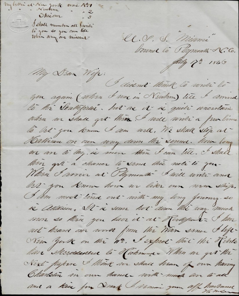 I am much better than when I wrote the 27th. I have been up three hours this afternoon. This is quite a pleasant place and if I was well, I could have had a chance to spend most of my time ashore. Now dear wife, do not feel uneasy about me for I think I shall be better soon. I was quite sorry that the Paymaster wrote to Father that I was sick. If he had not wrote, you would not have known it till after I was well again. It is quite hard work for me to write when I am laying down so you must excuse me if this is a little hard to read.