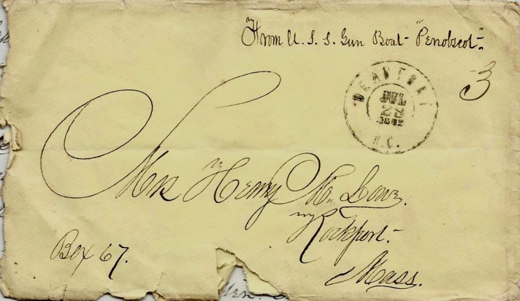 I think I will write a few lines to our Mary Blatchford, mother-in-law to one Henry M. Lowe, the son of Henry T. and Rachel Lowe. We are now thirty-five miles at sea in sight of three schooners. We shall board these and if everything is right, let them go on their way. We are on the move most of the time and we are ready to give the Rebels battle at any moment. You can rest assured that the Rebels are not able to hit the Gunboat Penobscot. They have tried that quite a number of times but it is a no go.