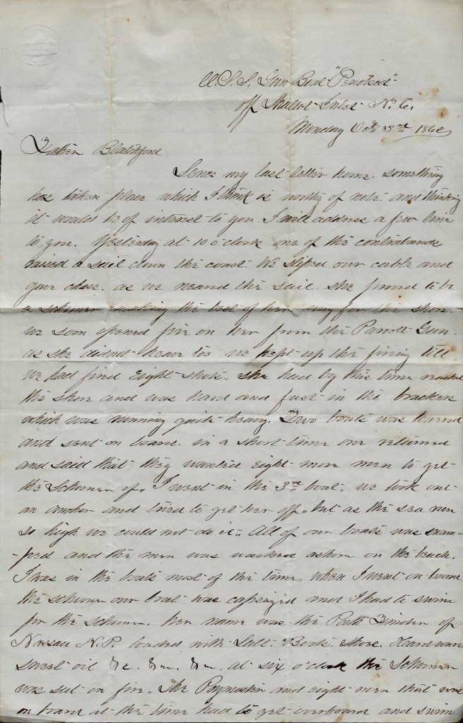 Yesterday we went down to the U. S. Steamer Columbia and sent a boat in to see if the Rebel had left anything. The found a 30-lb. Parrott Gun sent in our launch and got it safe on board. While our men was on board the Columbia we kept up a constant firing so to keep off the Rebels. We drove them from their guns and knocked their sand batteries in a knocked up hat. We learn by the way of three deserters that came off to the Cambridge that the Rebels on the morning of the 16th before light took the crew and officers as prisoners and that when we fired on the Columbia, there was about 40 Rebels on board. When they found that we was putting shot through her, they left for the shore. In their haste, 17 men was drowned in the surf. In the night the enemy came off to her and set her on fire. She didn’t burn much as the sea broke over her and put it out. On the 15th and 16th we kept up a fire on the Rebels all day. They fired on us from their batteries and some of their shots was very good ones. We had out topmast back-stay hit but two or three yams was cut away.