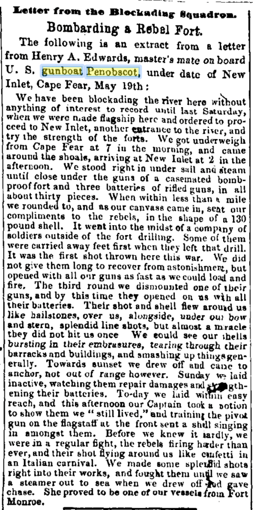 On Friday afternoon the 17th, we received orders from Fort Monroe to go round to this and to attack a fort at the mouth of this inlet. The fort [Fort Fisher 1] mounts twenty-eight guns. I do not know the name of the fort because it has been built since the war broke out. On the 18th at 5 o’clock in the morning we got under weigh and came round here. At three o’clock we opened fire on them and it was not long before they returned the fire, I can assure you. Our first shell fell short of their fort. The second one burst over them. The third one dismounted one of their largest guns and laid eight or ten men flat. All of our shots except the first were very good ones.