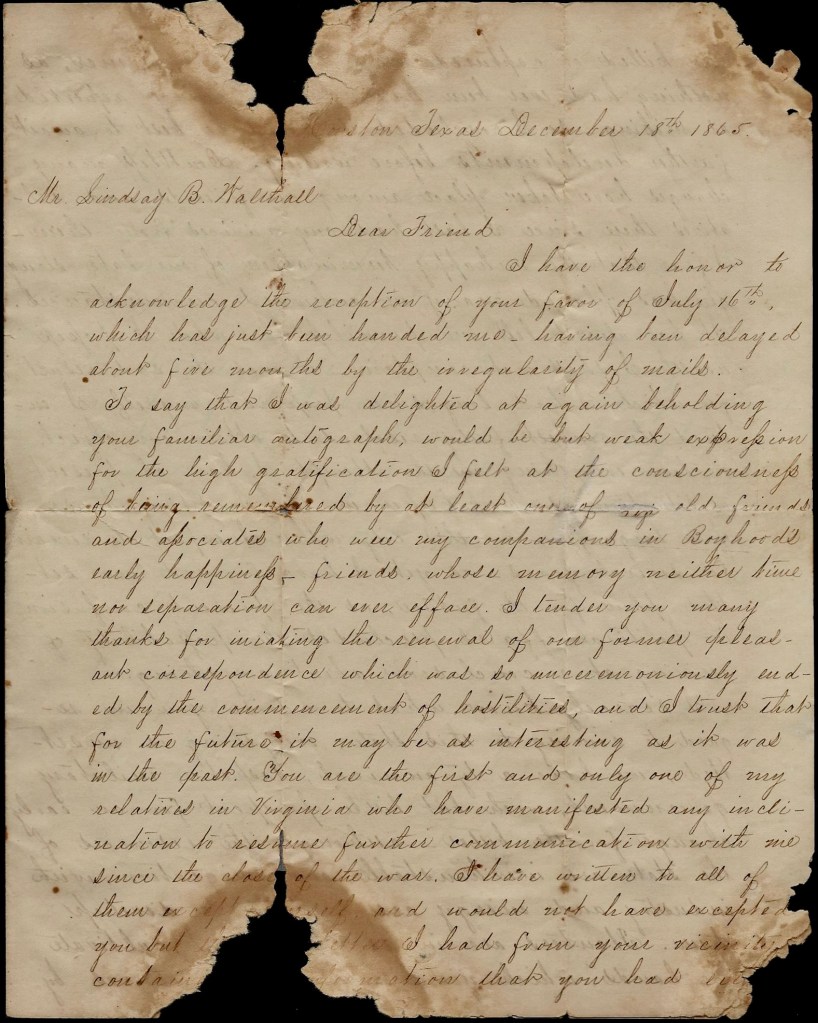 You are the first and only one of my relatives in Virginia who have manifested any inclination to resume further communication with me since the close of the war. I have written to all of them except yourself and would not have excepted you but the last letter I had from your vicinity contained information that you been killed or captured—most likely the former, as nothing had ever been heard from you since reported as missing. So I concluded it would be best to await further developments before writing.