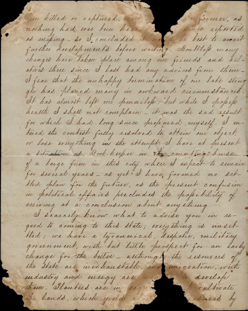 Doubtless many changes have taken place among our friends and relatives there since I last had any advices from them. I fear that the unhappy termination of our late struggle has placed many in awkward circumstances. It has almost left me penniless; but while I possess health, I shall not complain. It was the sad result for which I had long since prepared myself. I entered the contest fully resolved to attain our object or lose everything in the attempt. I have at present a situation as book-keeper in the counting house of a large firm in this city where I expect to remain for several years. As yet, I have formed no settled plan for the future, as the present confusion in political affairs precluded the possibility of arriving at a conclusion about anything.