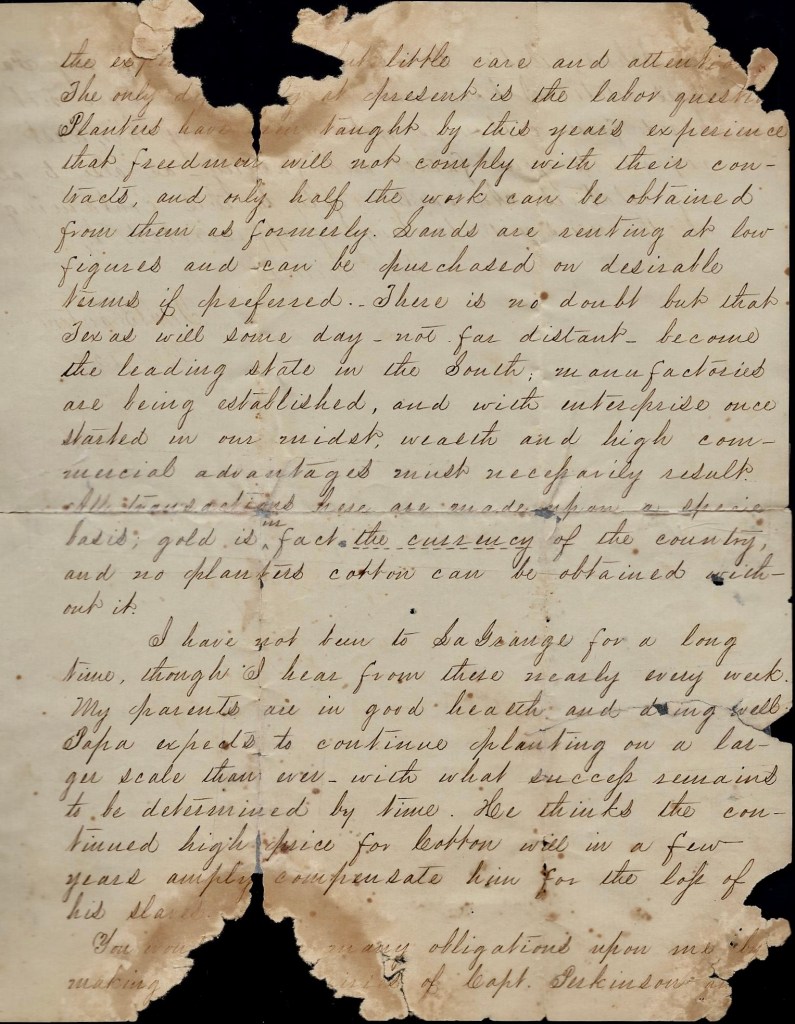 I scarcely knew what to advise you in regard to coming to this state. Everything is unsettled. We have a tyrannical, despotic, military government with but little prospect for an early change for the better—although the resources of the state are inexhaustible and emigration with industry and energy are wanted to develop them. Planters are in requisition to cultivate the lands which yield abundance and are pastured by the exertion of but little care and attention. The only [ ] at present is the labor question. Planters have been taught by this year’s experience that freedmen will not comply with their contracts, and only half the work can be obtained from them as formerly. Lands are renting at low figures and can be purchased on desirable terms if preferred.