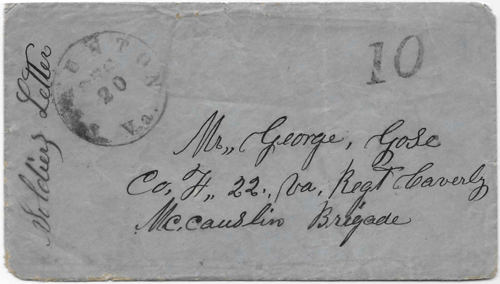 The following letter was written by J. J. Peck (1832-1864 or after) to George G. Gose (1822-1889), the son of David Philip Gose (1774-1832) and Anna Maria Spangler (1775-1845) of Burkes Garden, Tazewell county, Virginia. George was married to Catharine Sluss Groseclose (1823-1901) in September 1846. George was in the Confederate service during the war; his military record indicates he was in both the 45th Virginia Infantry for a time as well as the 22nd Virginia Cavalry.