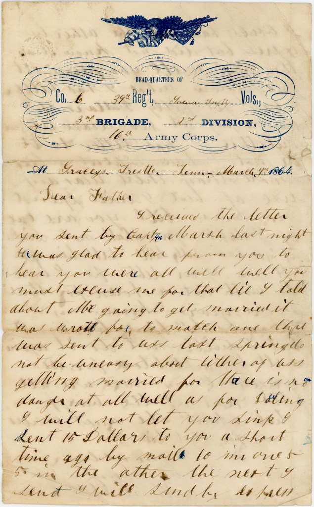 I received the letter you sent by Capt. Marsh last night & was glad to hear from you to hear you were all well. Well, you must excuse me for that lie I told about me going to get married. It was write for to match one that was sent to us last spring. Do not be uneasy about either of us getting married for there is no danger at all.