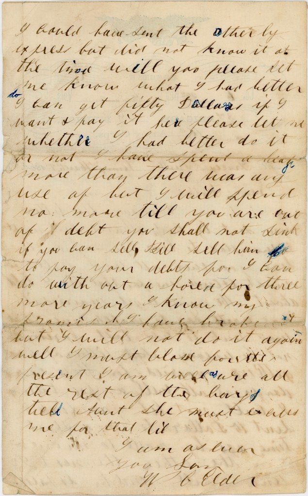 Well, as for [ ing], I will not let you sink. I sent 15 dollars to you a short time ago by mail—10 in one & 5 in the other. The next I sent I will send by express. I could have sent the other by express but did not know it at the time. Will you please let me know what I had better do. I can get fifty dollars if I want and pay it here. Please let me know whether I had better do it or not. I have spent a heap more than there was any use of but I will spend no more till you are out of debt. You shall not sink if you can sell Bill. Sell him to pay your debts for I can do without a horse for three more years. I know my promise to have broke it but I will not do it again.